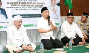 Wakil Bupati Sukabumi H Andreas menghadiri Peringatan Isra Miraj Nabi Muhammad SAW sekaligus Silaturahmi Alumni PD-PKPNU MWC NU Kecamatan Nagrak, di Aula Kantor Desa Pawenang, Kecamatan Nagrak, Minggu (25/1/2025).